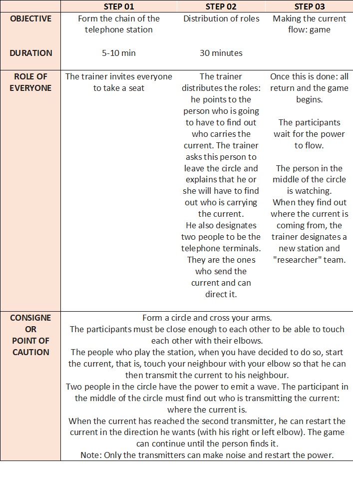 This tool is a game in which participants try to find the starting point of a movement on a human chain.