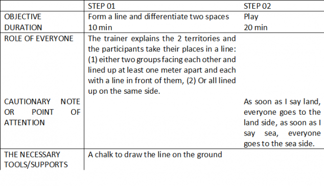 The participants stand next to each other in a straight line and will have to move from one world (land or sea) to the other following the instructions of the trainer.