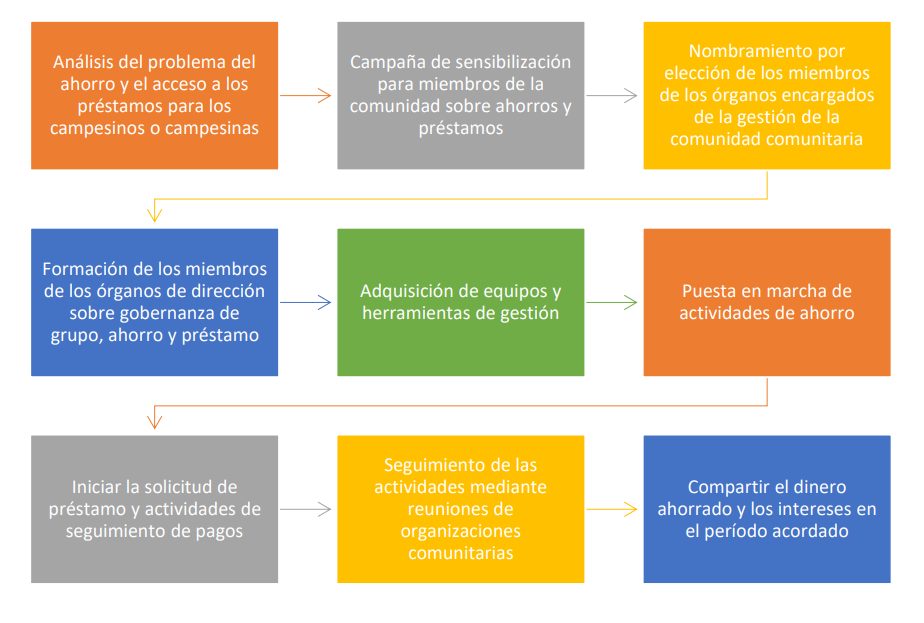 La sensibilización sobre el ahorro y los préstamos se lleva a cabo durante visitas individuales a las organizaciones comunitarias, facilitadas por el equipo de facilitadores del proyecto. Estos animan a los miembros de las organizaciones comunitarias a intercambiar opiniones sobre los problemas a los que se enfrentan en su vida cotidiana y cómo pueden abordarlos mediante el sistema de ahorro y crédito conocido como tontina. Durante estas sesiones, se hace especial hincapié en la importancia del ahorro y los préstamos, las modalidades de ahorro y crédito que deben aplicarse, el establecimiento y el respeto de los reglamentos o estatutos, la integridad de los miembros y el uso de herramientas de gestión adecuadas, entre otros aspectos.